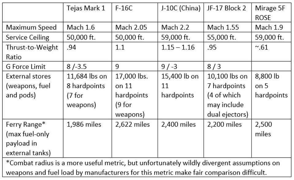 Table comparing performance of TEJAS to single-engine jets operated by China and Pakistan