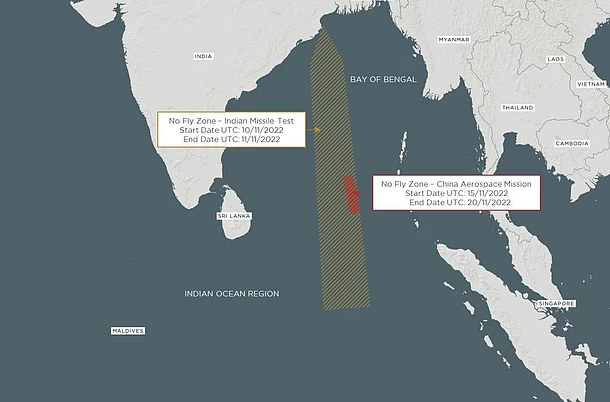 Interestingly, the deployment of the Chinese spy ship "appears to be in sync with a Chinese aerospace mission that flies over the bay of Bengal between 15-20 November 2022," open source intelligence expert Damien Symon has pointed out. The mission, as shown in the map below, "would put the Yuan Wang VI near the Indian missile test's splash zone," he added.